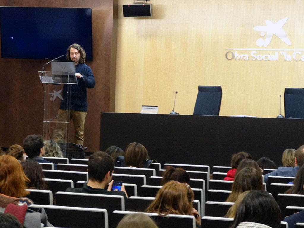 D. Caleb Araguàs, graduado en Podología y master en fisiología integrativa durante su ponencia.